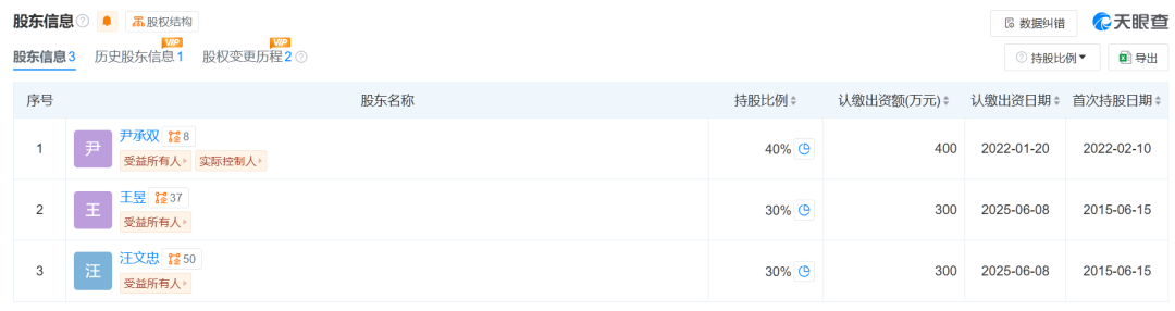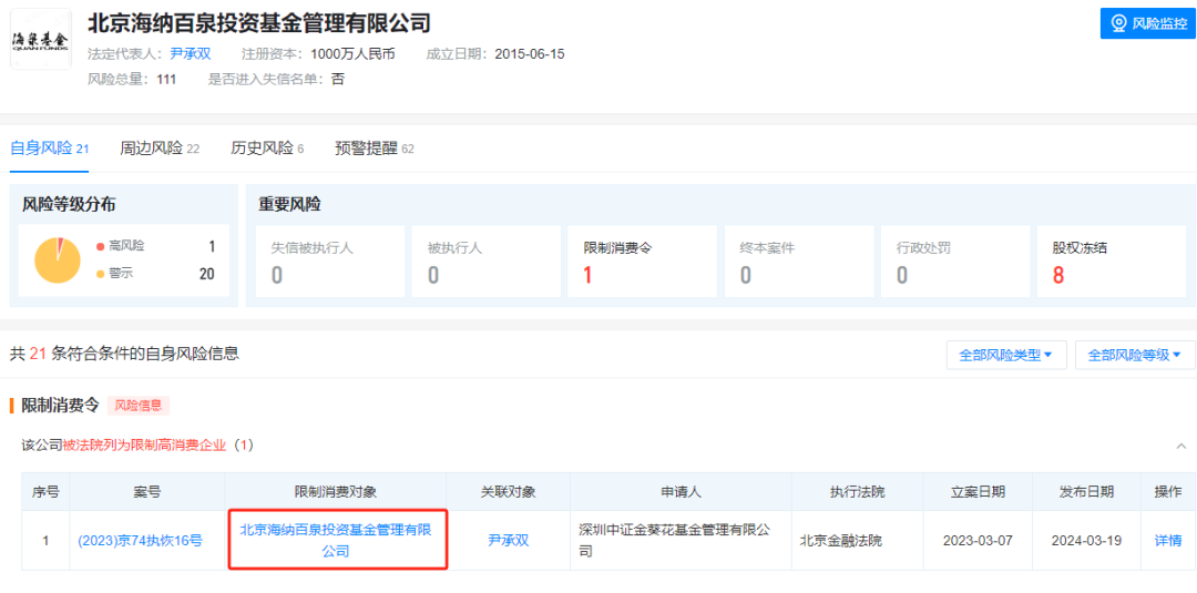 值得注意的是,根据天眼查显示,胡海泉已于2022年2月退出海纳百泉股东行列,目前公司法定代表人为尹承双,股东包括尹承双(持股40%)、汪文忠(持股30%)、王昱(持股30%)。但是在中基协披露信息来看,胡海泉依然是海纳百泉法人代表,并担任董事长一职,两处披露信息并不同步。
