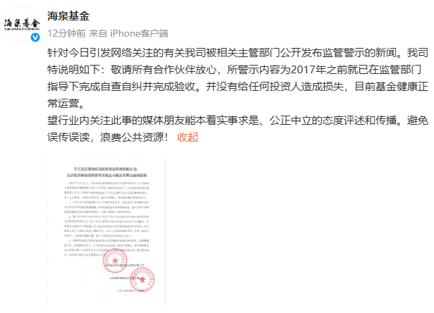 4月24日下午,海泉基金在微博发布声明回应称,所警示内容为2017年之前就已在监管部门指导下完成自查自纠并完成验收。并没有给任何投资人造成损失,目前基金健康正常运营。