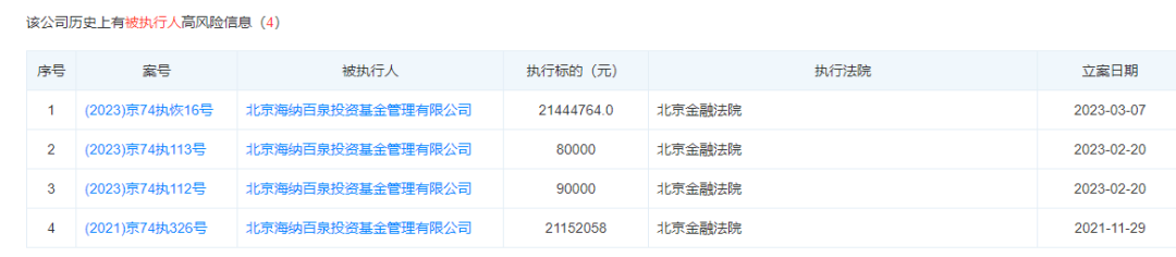 目前海纳百泉大股东处于限高状态,且海纳百泉也四度成为被执行人。