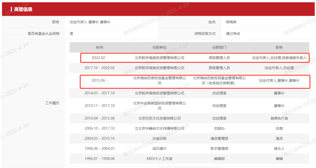从中基协公开信息来看,海纳百泉投资和乾祥海泉投资的法人代表均为艺人胡海泉,两家私募也均为股权、创业投资类私募基金。